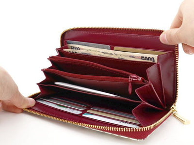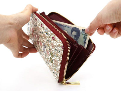 Generously-sized long wallet creates a broad palette to enjoy the bunko leather pattern.