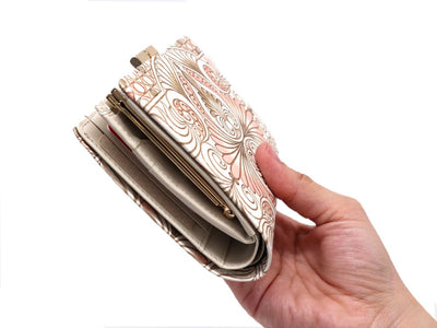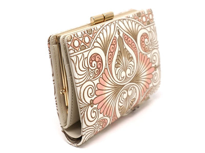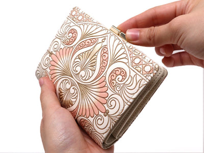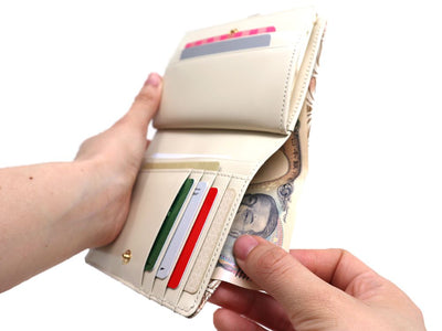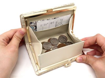 Open the clasp to reveal a compact little box-shaped change pouch. The design makes it easy to find the coins you’re looking for, and you can store plenty of them without worrying about the wallet bulging. Say goodbye to stress at the register! The sleek gold clasp design is simple and beautiful to look at. Lots of our customers end up purchasing this beloved gamasatsu wallet again and again.