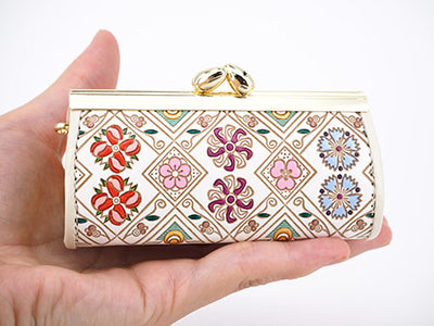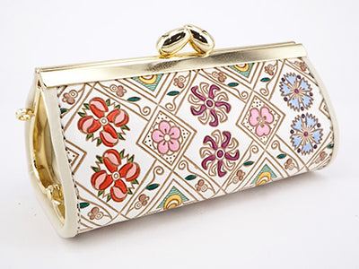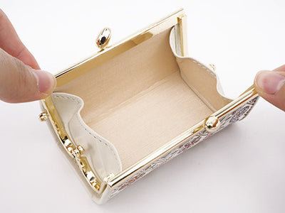 Elegant gold clasp, plain ivory leather on the sides with carefully-sewn seams for an added touch.