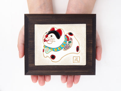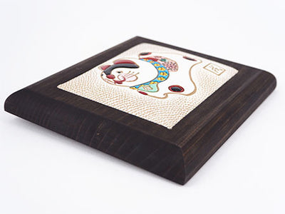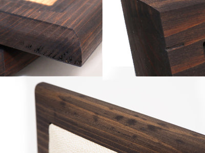 We designed this decorative plaque after many customers told us they wanted a way to display bunko leather for everyday enjoyment. We reached out to Takanori Kamimura, a renowned fretsaw artisan in Kiso, to create the wooden backing. It’s made from waxed Japanese cedar that’s purposely left unpainted to better showcase the natural grain and ensure that every piece is wonderfully unique. We then insert a piece of bunko leather into the wooden frame, giving it a bit of a cushion so it’s as fun to touch as it is to look at.