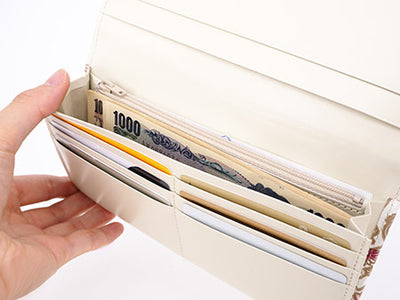 Bills are stored flat, with slots for six cards. Change pouch has a long pocket in the back that’s perfect for storing receipts.
