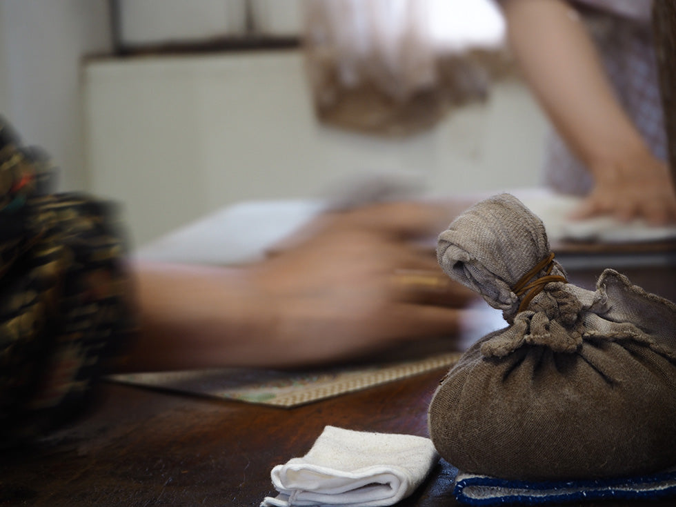 At Bunkoya Oozeki, we combine the makomo powder with lacquer, and then carefully rub it into the grooves in the embossed bunko leather. This is what creates the distinctive “antiquing” effect.