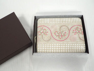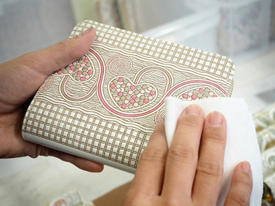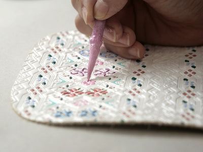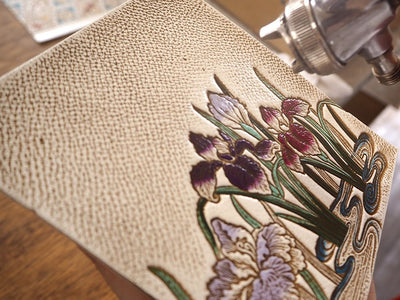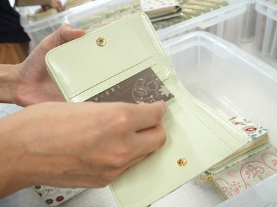 We start by embossing the white leather with a design (like an ukiyo-e print, traditional crest pattern, or flower pattern). We then color it by hand, brushstroke by brushstroke, before putting it through an antiquing process that makes use of Japanese lacquer. We then sew the wallet or accessory together to create the finished product. Our lacquer-based antiquing process is called sabi-ire. It also uses the powdered spores of a certain type of plant Makomo.