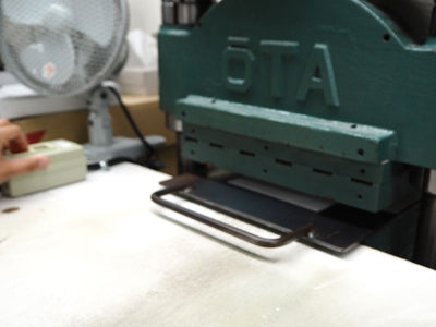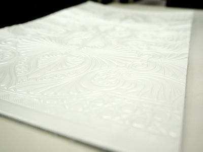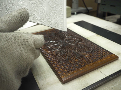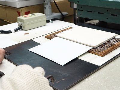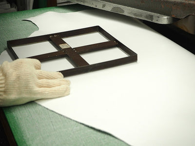 White leather softened for use as bunko leather is cut to the right size for each item and then embossed with a pattern.