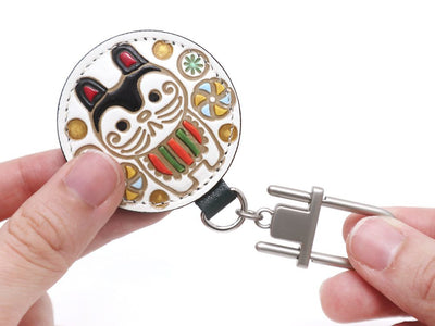 Magnet covered in a bunko leather pattern with U-shaped clip. Patterns are oriented to look great hanging from a key.